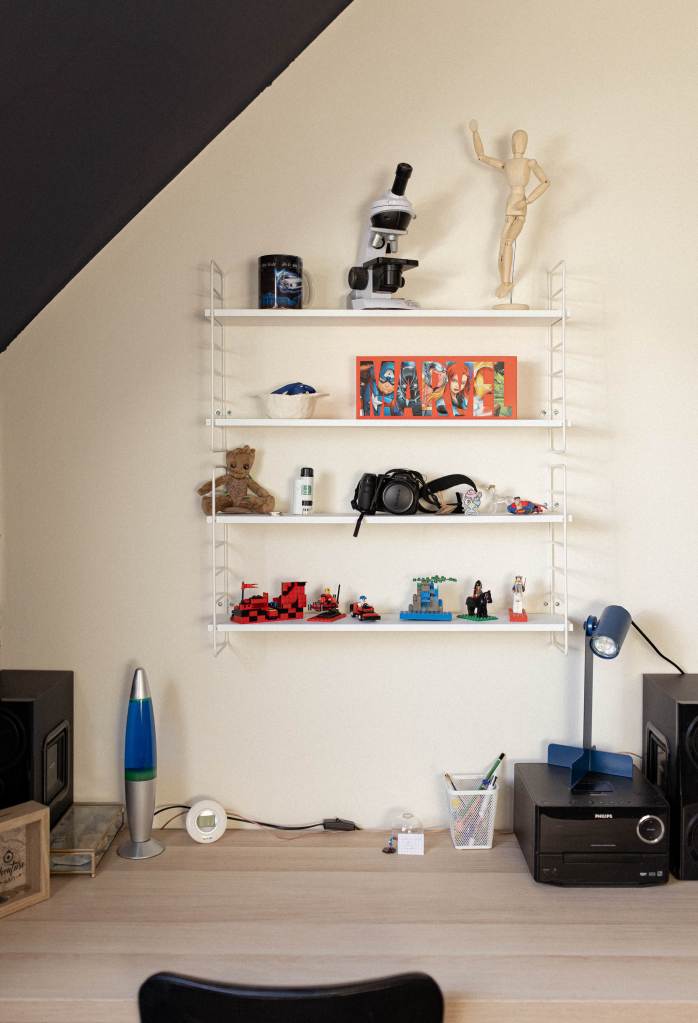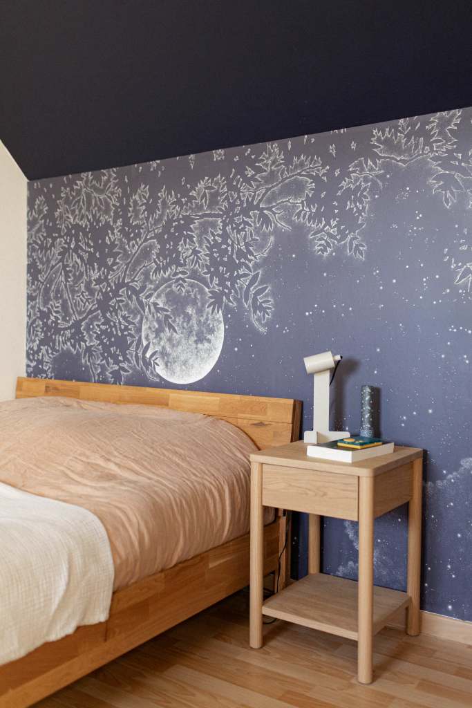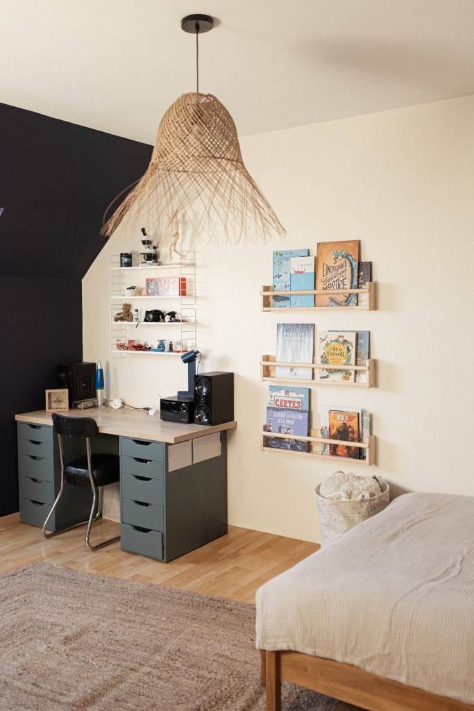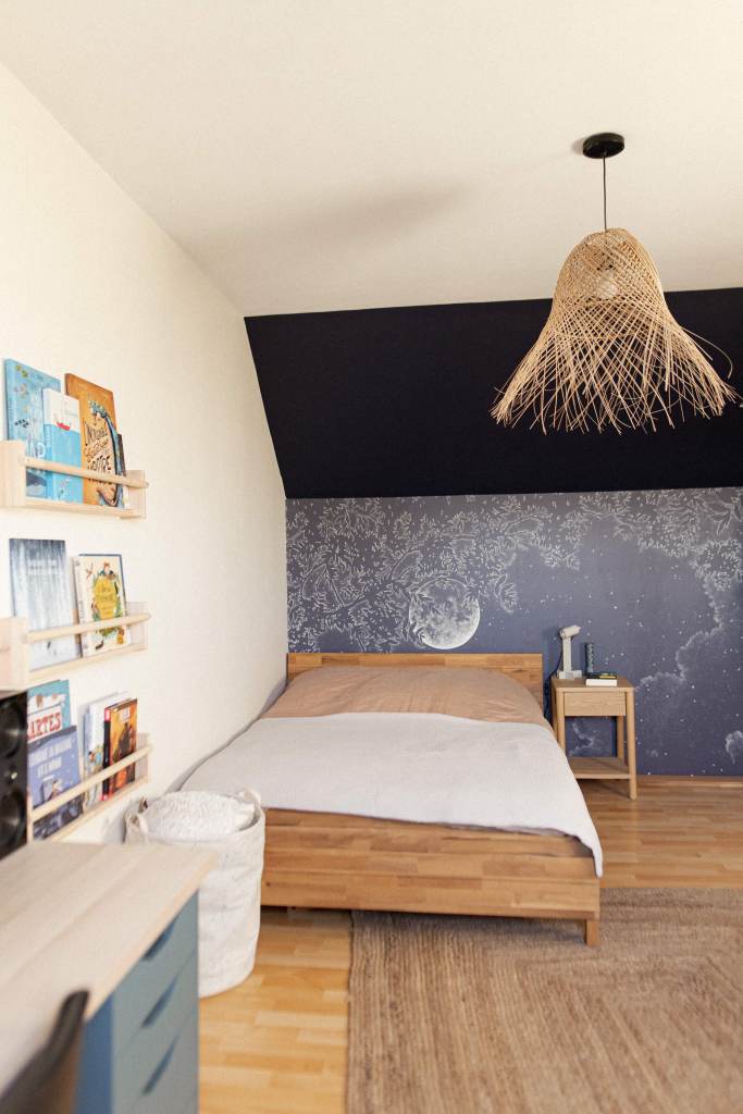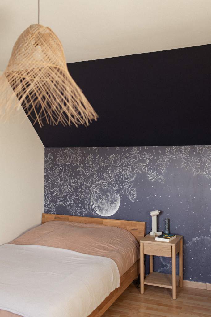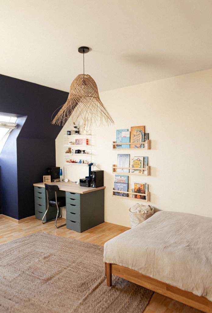 Rénovation partielle d’une chambre pour un jeune ado en quête d’un espace qui lui ressemble. L’objectif du projet : créer une ambiance affirmée et ressemblant à la personnalité de J. Un panoramique en tête de lit donne le ton, porté par un bleu nuit profond et intense, subtilement équilibré par un crème doux et chaleureux. Chaque recoin est optimisé pour structurer la pièce et allier style et fonctionnalité, répondant ainsi parfaitement aux besoins du quotidien de J.